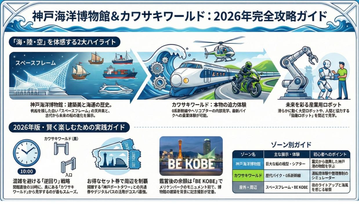 海洋博物館は屋内のため、雨の日や気温の厳しい日には非常に多くの観光客が集中します。特に週末の午後(13:00〜15:00)は、家族連れでシミュレーターや搭乗体験が長蛇の列になることも珍しくありません。初心者がストレスなく楽しむための最強の戦術は、「開館直後の午前10時にカワサキワールドから攻める」ことです。多くの人はまず海洋博物館の歴史展示から順番に回りますが、あえて奥のカワサキワールドを先に見ることで、人気の新幹線やバイクの撮影を独占状態で楽しむことができます。