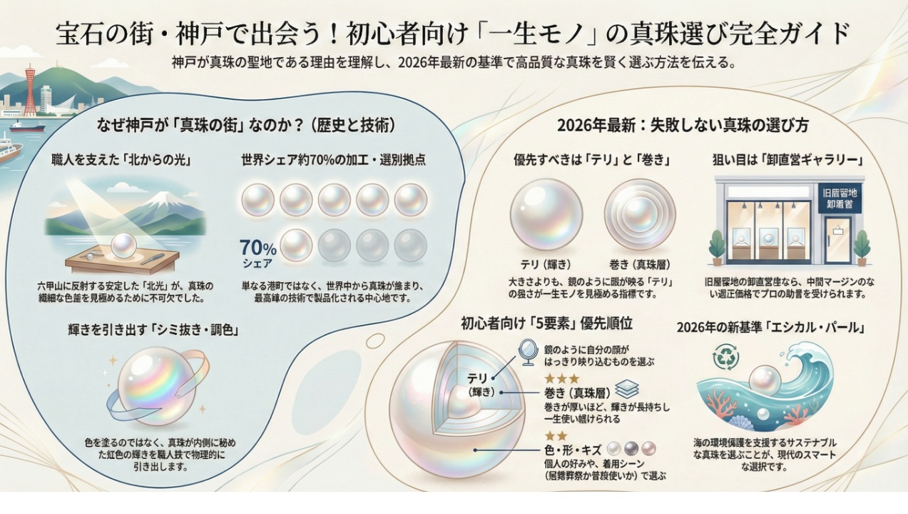 この記事を前から順に読み進めるだけで、一生モノの輝きを見極める目が養われ、洗練された神戸の真珠文化を120%楽しむための完璧なガイドが完成します。港町の潮風と真珠の気品に包まれる、特別な散策を始めましょう。