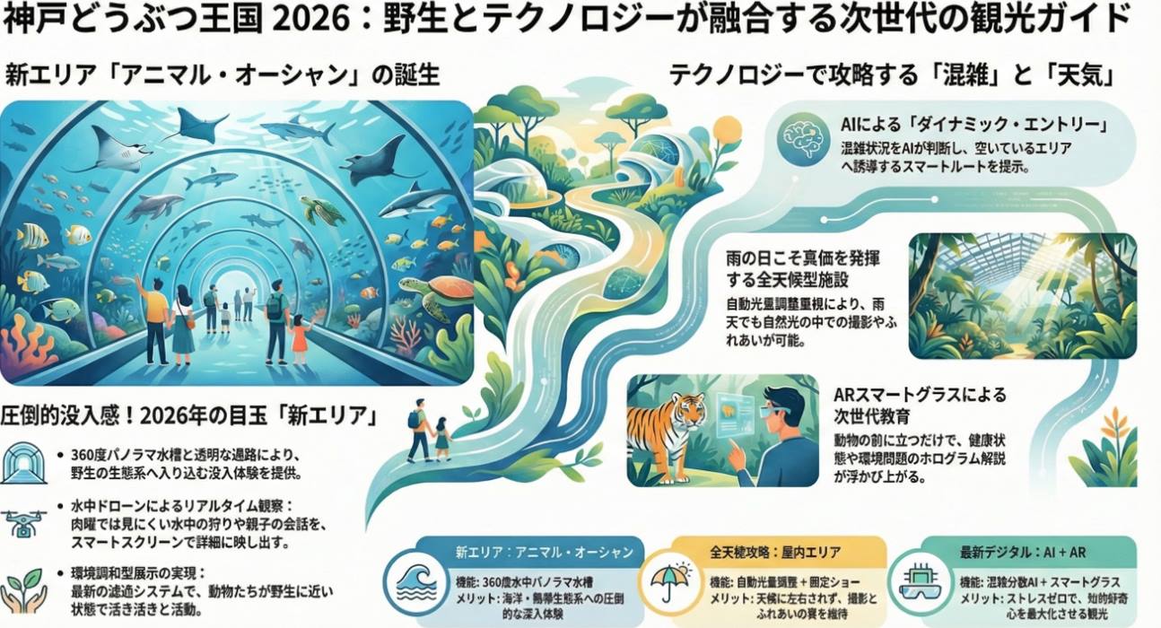 - 2026年の神戸どうぶつ王国観光は、新エリア「アニマル・オーシャン」の没入型展示が核心。