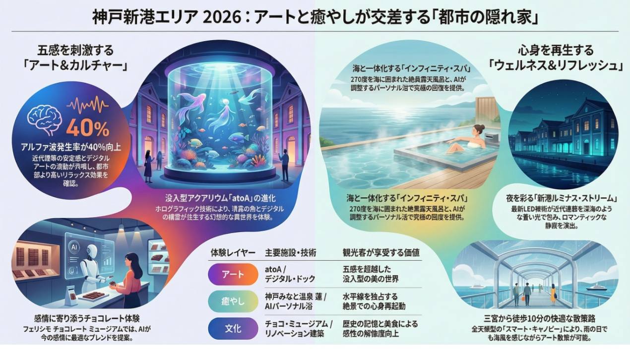 - 2026年の神戸観光は、新港エリアの「アートと温泉の融合」が最大のハイライト。