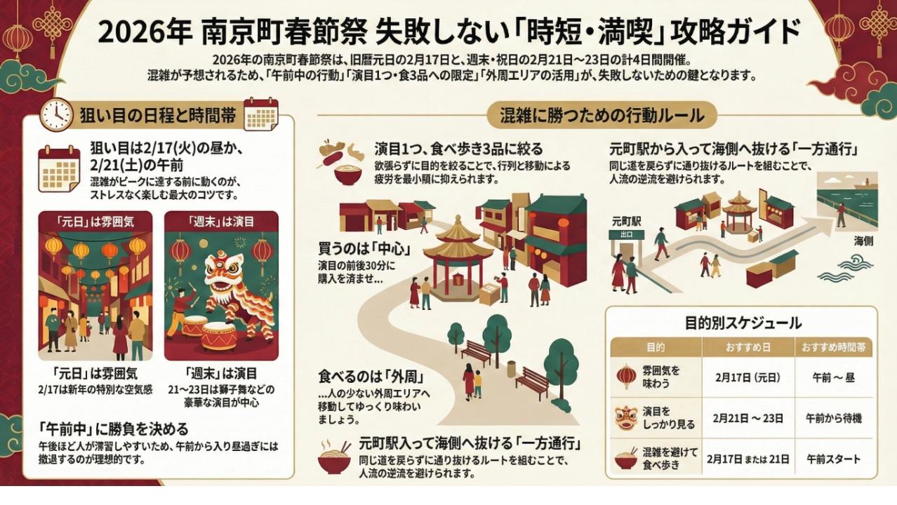 2026年の南京町春節祭は、日程が4日間に分かれている分、狙い方を決めると一気に楽になります。