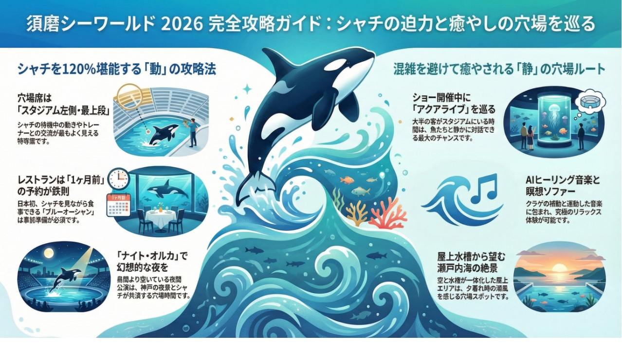 • 2026年の須磨シーワールド観光は、シャチのパフォーマンスと穴場エリアの使い分けが重要。